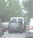 DELANTE, 4 TRANSPORTES PARADOS EN DOBLE FILA.
